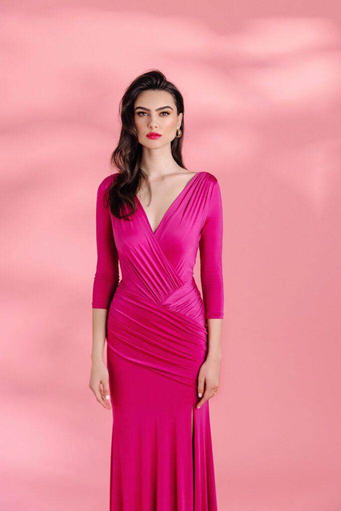 Duga haljina V – izreza na preklop s bočnim prorezom i 3/4 rukavima.