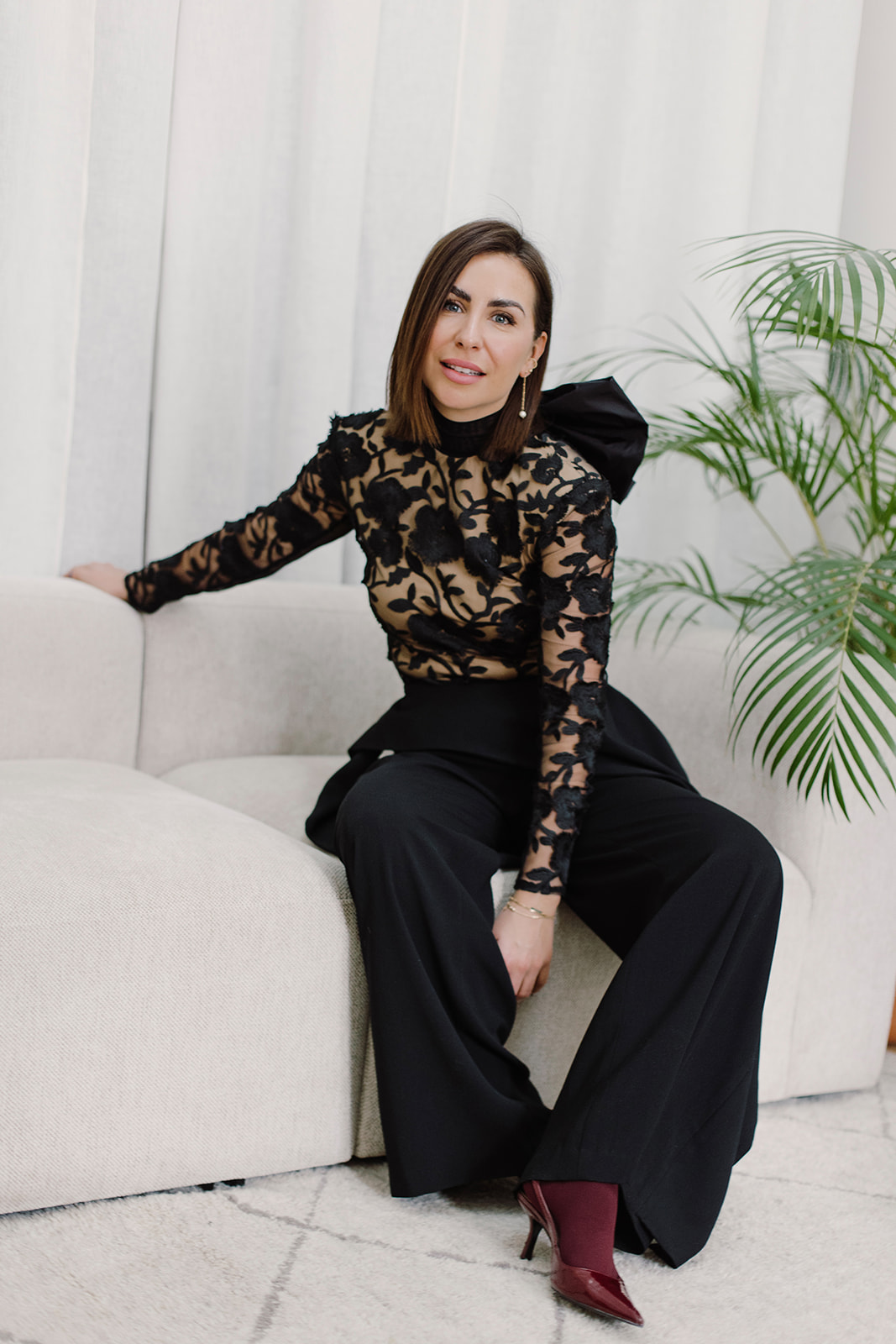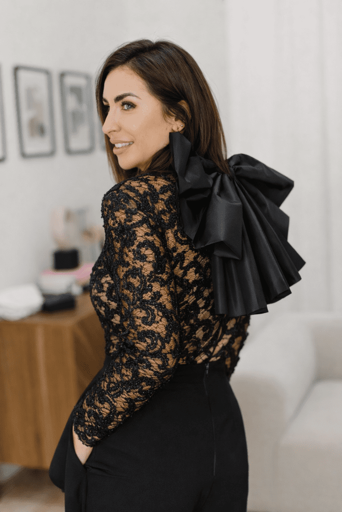 Elegantan i upečatljiv crni top savršen za sve posebne prilike i večernje izlaske. Izrađen od fine, prozračne čipke s bogatim uzorkom, naglašava ženstvenu siluetu i pruža sofisticiran izgled. Poseban detalj koji ga izdvaja je velika dekorativna mašna na području leđa, koja daje dozu dramatičnosti i luksuza.