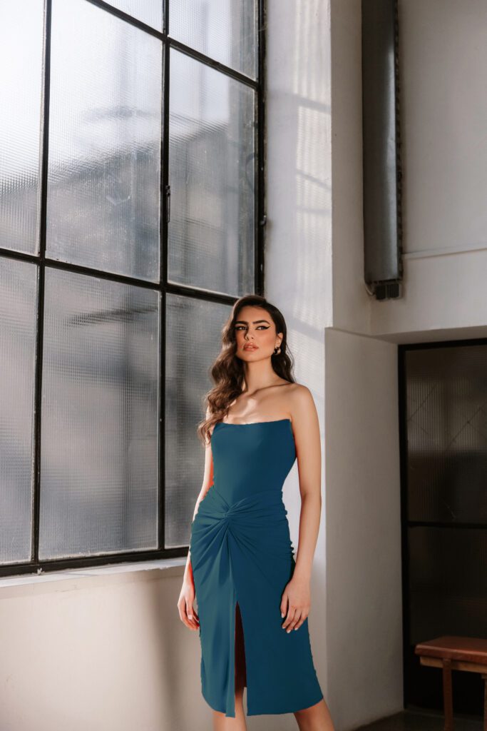 U donjem dijelu je čvor, i elegantni rasporak koji otkriva koljena.