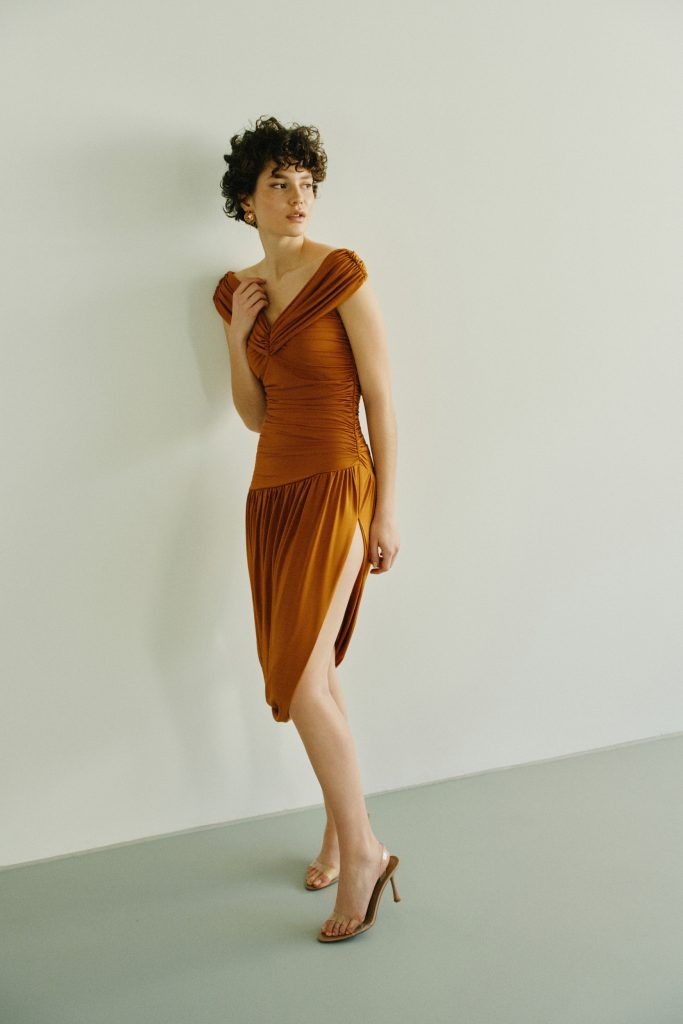 Ležerna midi haljina niskog struka s naborima. Na niski se struk haljina nastavlja neopterećeno te ima blagi V izrez koji stvara elegantnu formu kratkih rukava. Idealna za sve svečane prigode.