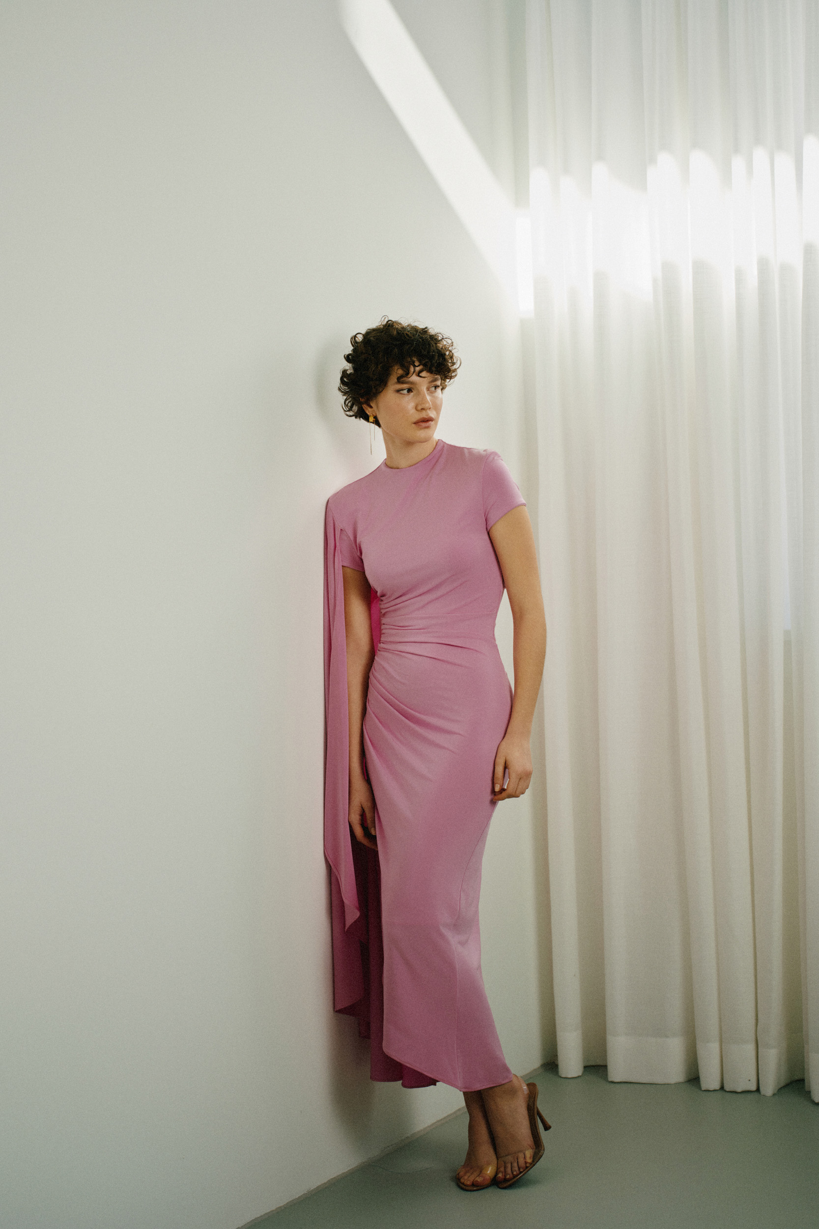 Nabrana je cijelom dužinom, a poseban element haljine čini plašt koji je lepršav i daje wow efekt.