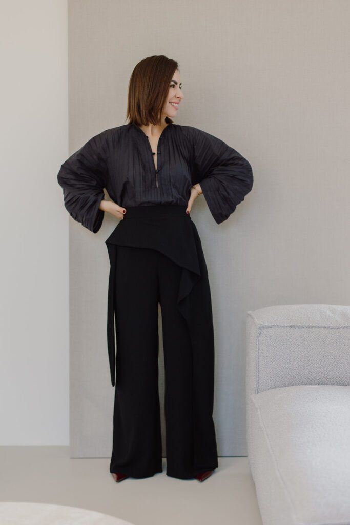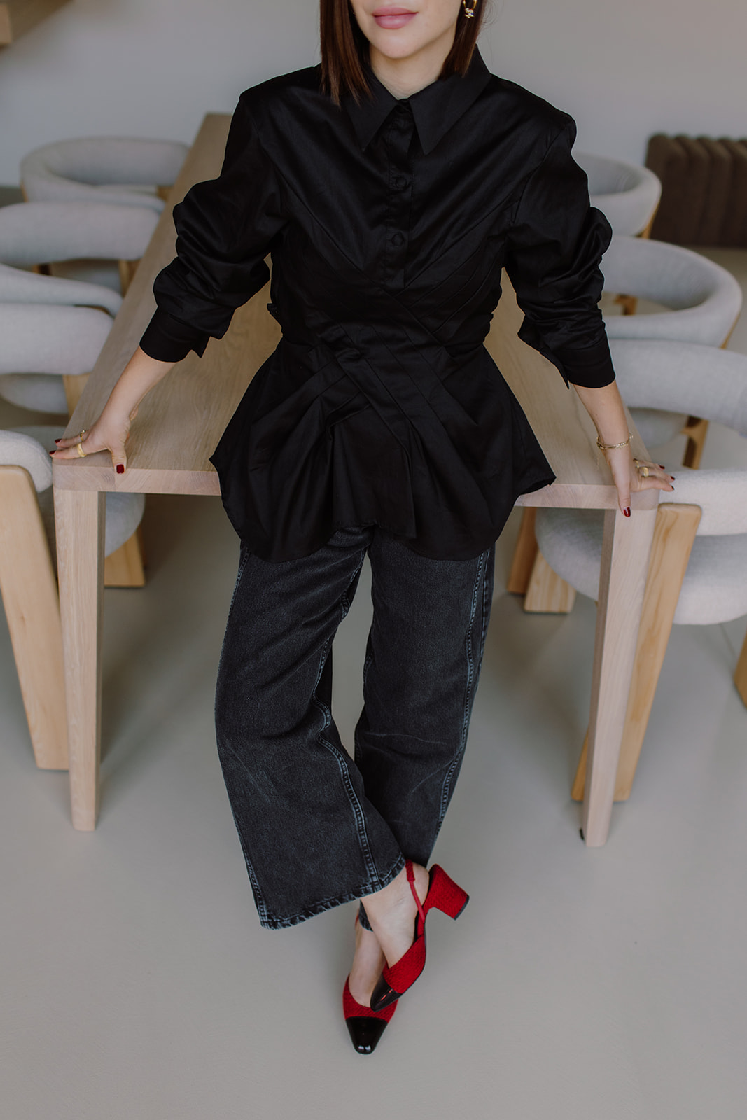Plisirana košulja s predimenzioniranim rukavima i stojećim ovratnikom.