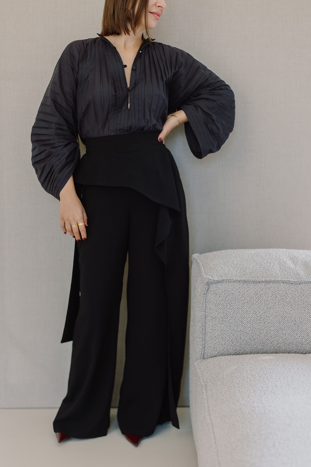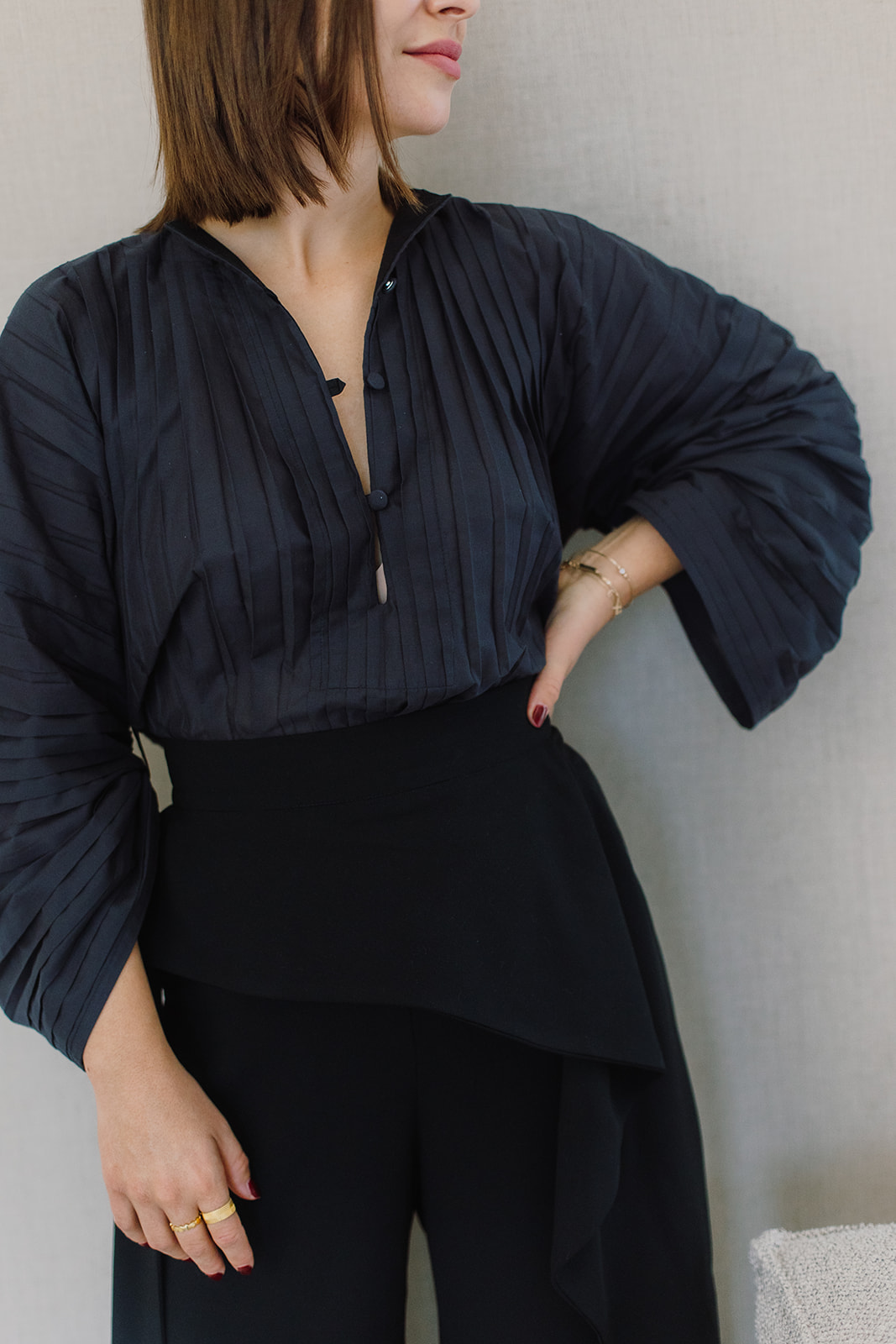 Plisirana košulja s predimenzioniranim rukavima i stojećim ovratnikom.