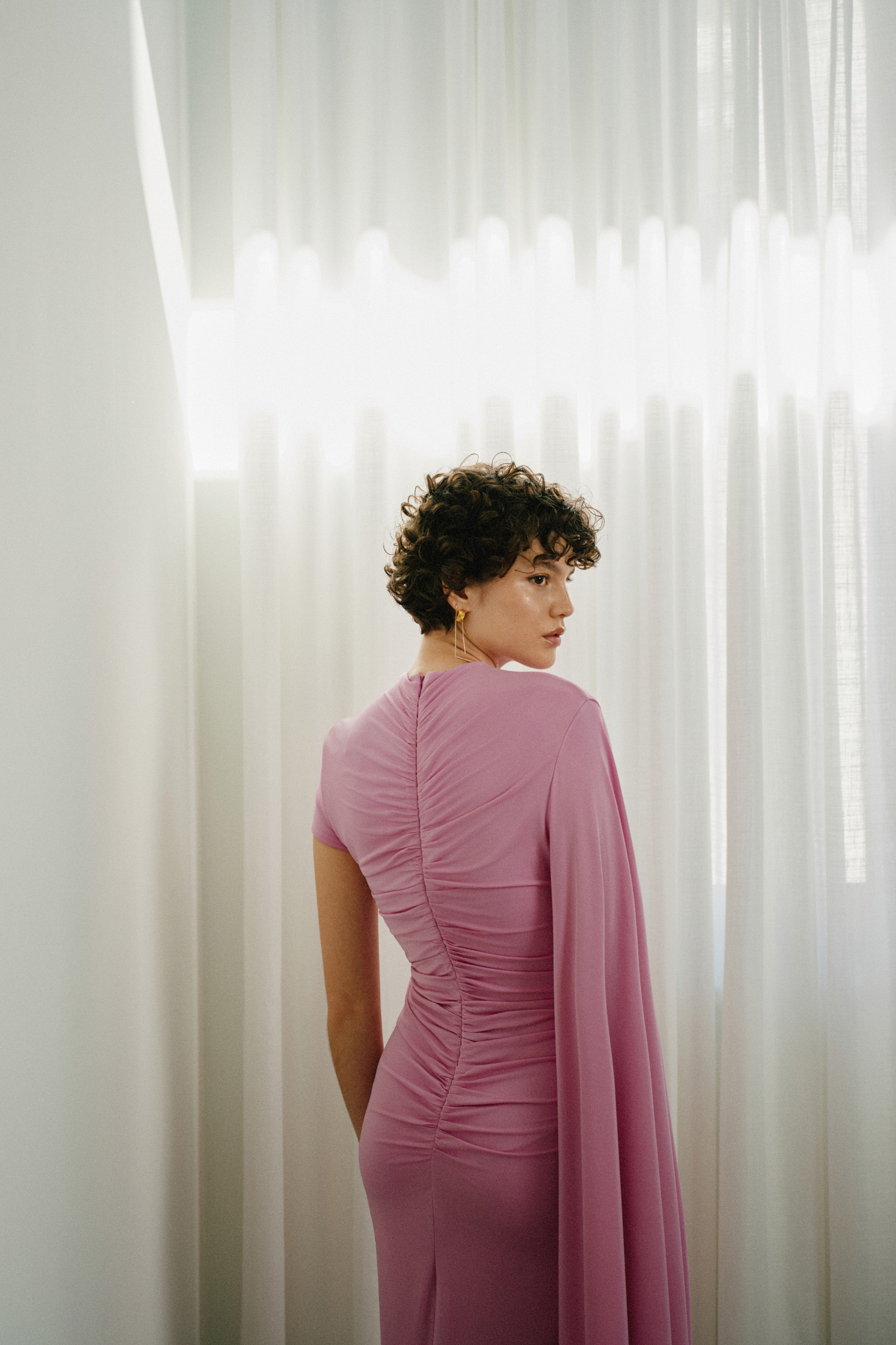 Duga lepršava haljina V-izreza i zvono rukavima.