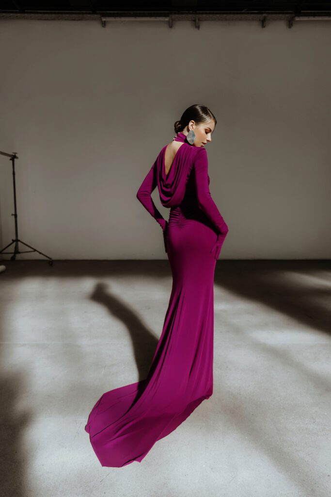 Elegantna duga haljina s dolčevitom i otvorenim leđima.