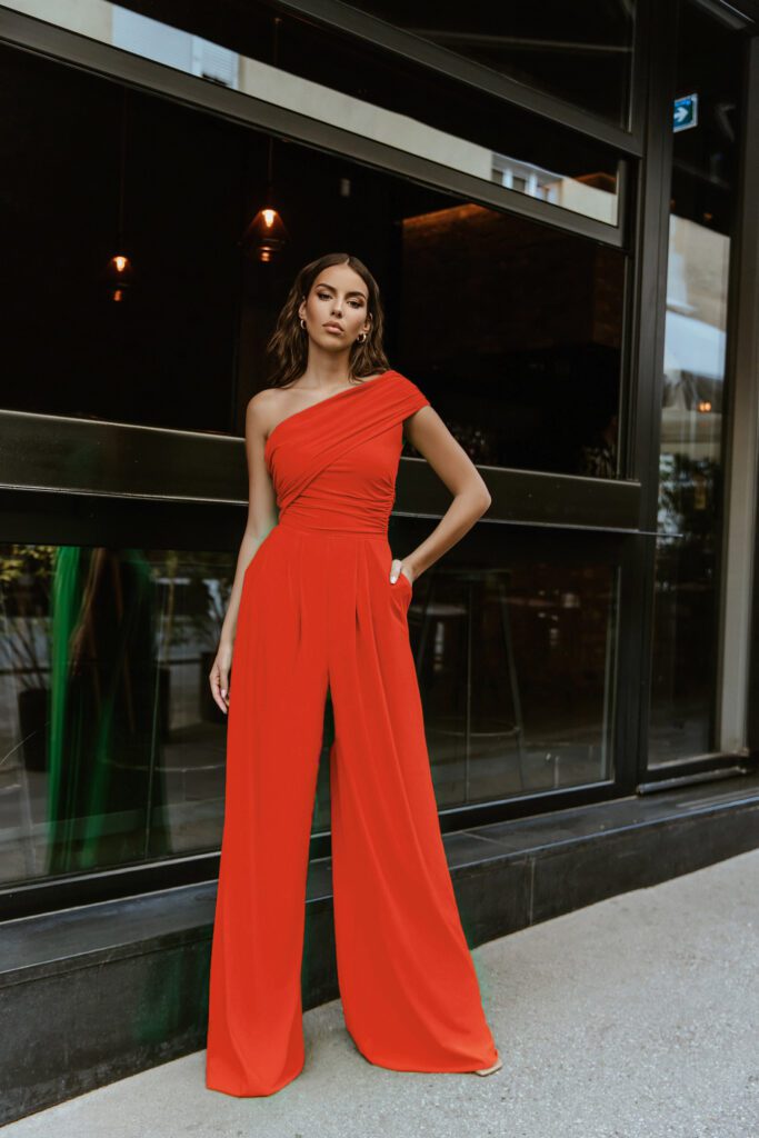 Dugi kombinezon na jedno rame, otvorenih ramena i širokih nogavica.